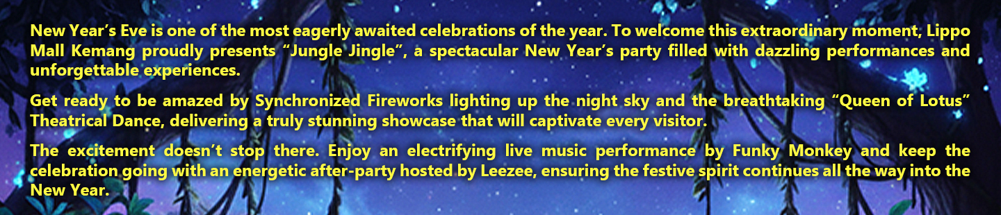 - Mohon cek akun Instagram Lippo Mall Kemang (@lippomallkemang) secara berkala untuk informasi lebih lanjut seputar “Jungle Jingle – The Magical New Year Celebration”.